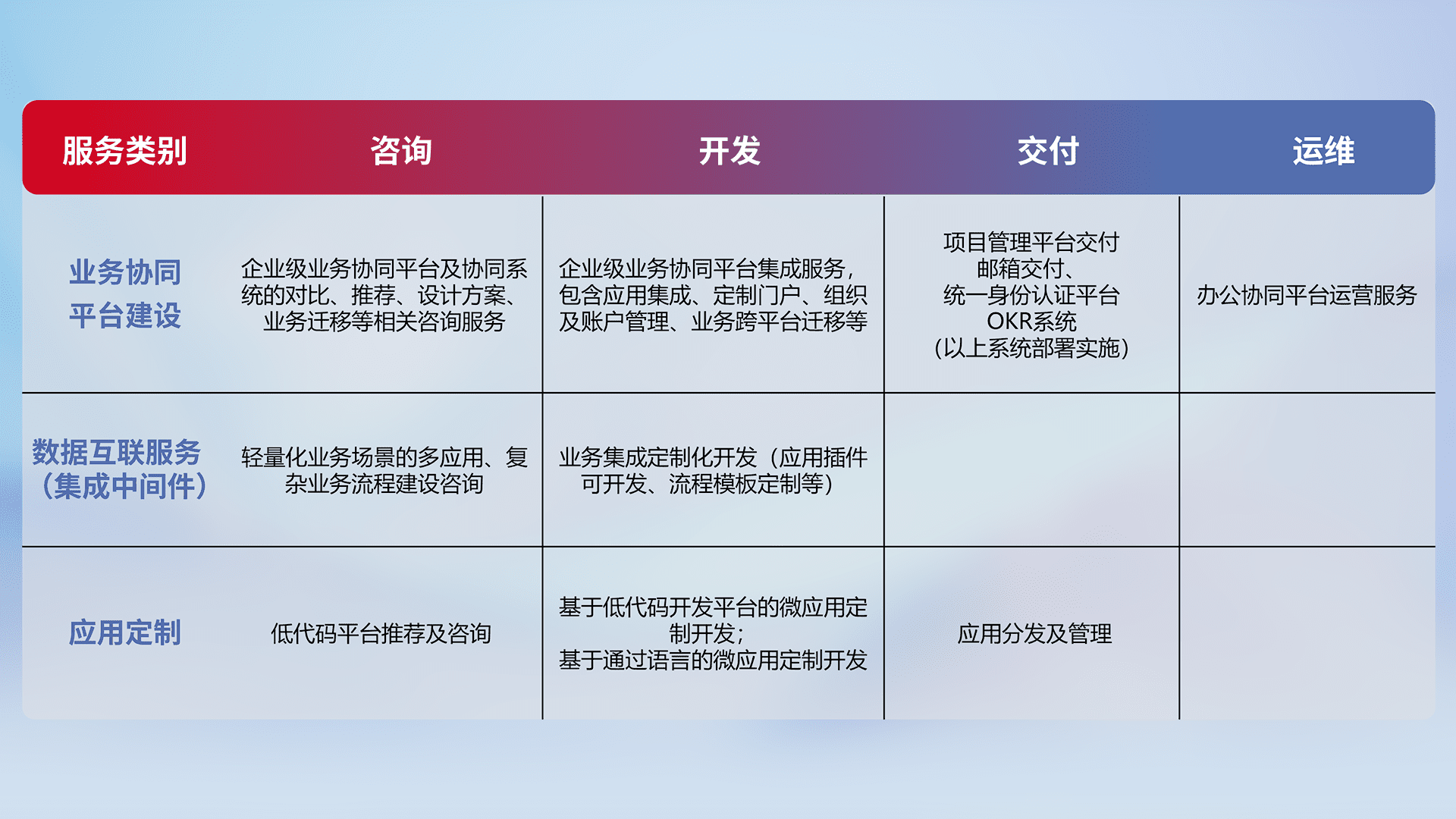 针对钉钉、、企微、、、IDaas等平台级产品提供产品的规划、、、、方案、、、、交付、、、定制化开发等服务,,,,实现如统一协同办公、、、智能客户服务、、、混合会议管理、、、、智能数据查询、、、、等业务场景,,实现数字化转型。。。。