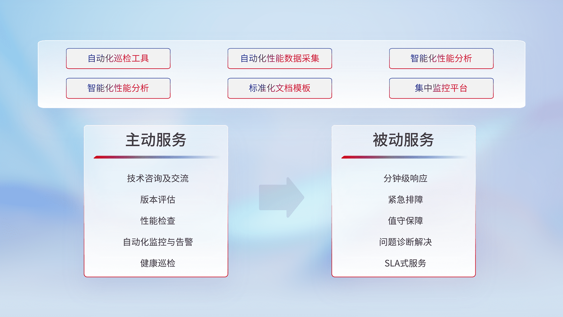 智能化工具和标准化文档,,保障服务质量,,,,提供主动服务(包含技术咨询、、、、版本评估、、、性能检查、、、自动化监控与告警、、、、健康巡检)和被动服务包含(分钟级响应、、紧急排障、、值守保障、、问题诊断解决、、SLA服务)。。。。